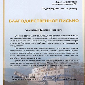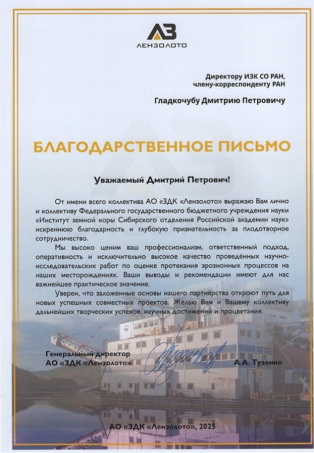 Коллектив и директор АО «ЗДК «Лензолото» выразили благодарность за плодотворное сотрудничество Институту земной коры СО РАН и лично директору, члену-корреспонденту РАН Гладкочубу Дмитрию Петровичу и вручили благодарственное письмо.